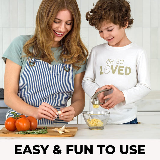Garlic Press with Soft, Easy to Squeeze Handle - Includes Silicone Garlic Peeler & Cleaning Brush